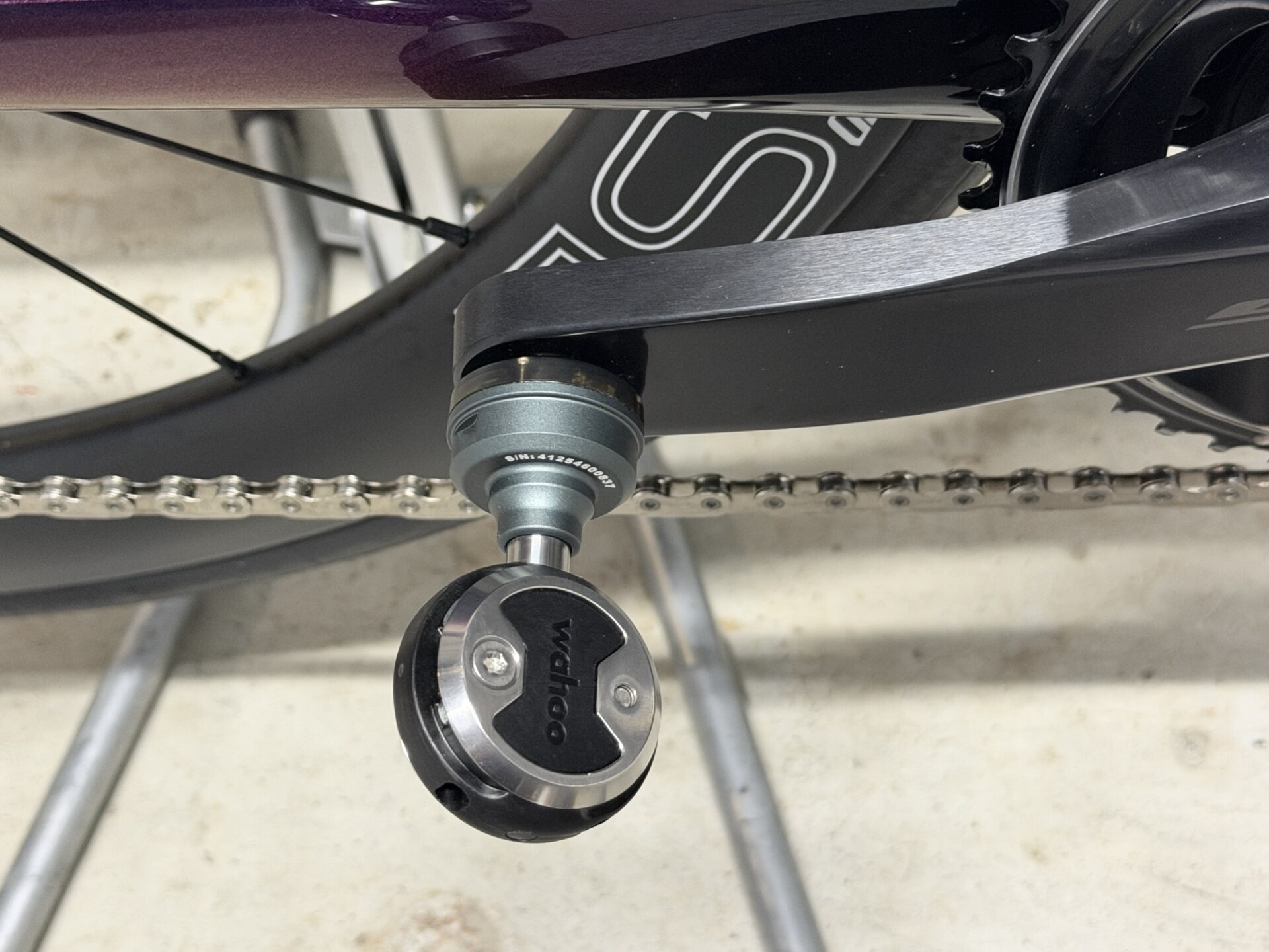 ペダルはもちろん付属しませんので、手持ちのものを取り付けます。1月にWahooの公式サイトで、新品91000円で購入したSPEEDPLAY POWER Dual-Sided Power Pedalsを使うことにします。今のロードバイクトレーニングにパワーメーターは欠かせないものだと思っています。