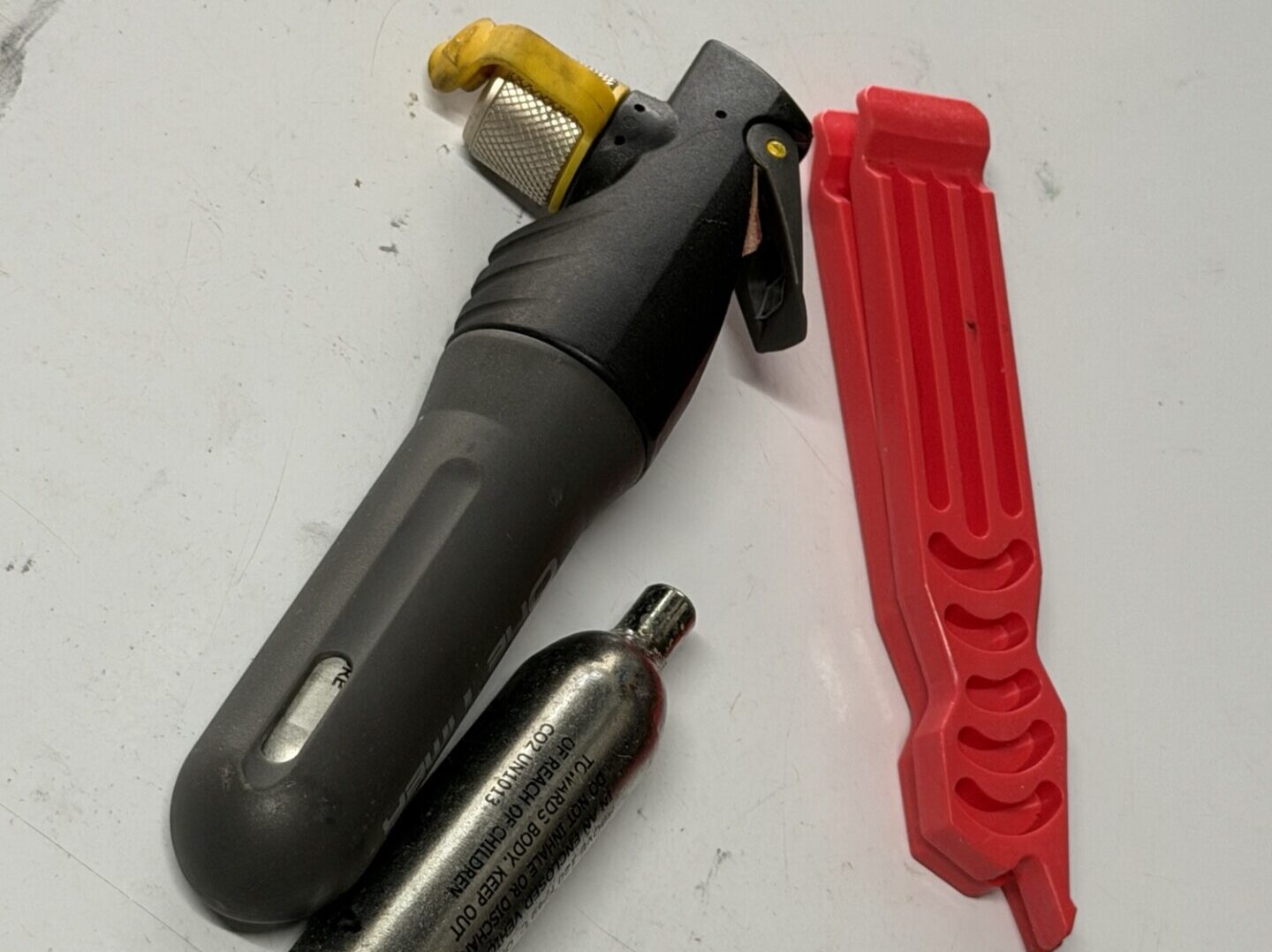 自分は少しやってダメなら、すぐCO2ボンベに頼ることにしています。一度上がってしまえば、その後は普通のポンプで運用できるようになりますからね。CO2ボンベを2本使って前後輪ともにビードを上げましたが、かなり空気圧を上げないとビードが全て嵌合しませんでした。