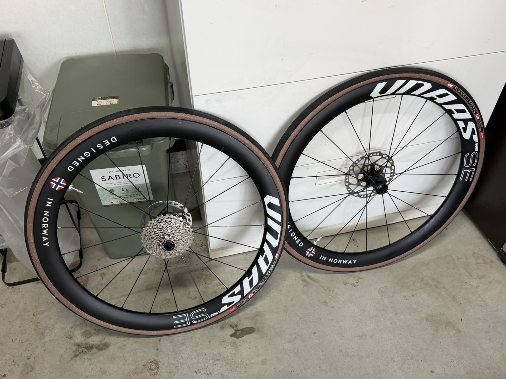ホイールはUNAAS HARD SEというカーボンリムのものが付属します。スチールスポークなので前後輪で1,580gと軽くはないですが、リムハイトは50mmもあります。Winspaceの公式サイトでの販売価格は98,000円なので、完成車にこのホイールが付属するのは良心的でしょう。